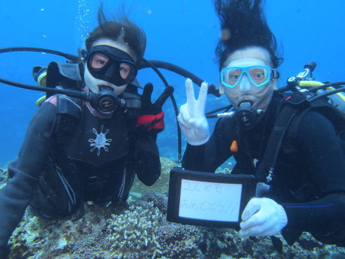 天候:晴れ 海峡:ややうねりあり 気温:30度 水温:28度 透明度:25m メニュー:ケラマ3ダイブキャンペーン・ケラマ諸島カメ観察体験ダイビング PADIオープンウォーターダイバーコース コメント:ティーダが開催するケラマ諸島ツアーおよびPADIコースにご参加ありがとうございます。無事、体験ダイビングはカメも見れて、小物、大物とファンダイビングは喜び、なによりもサプライズプロポーズも成功に終わり、とてもよい日となりました!またこのグループでお会いできること、楽しみにしております。